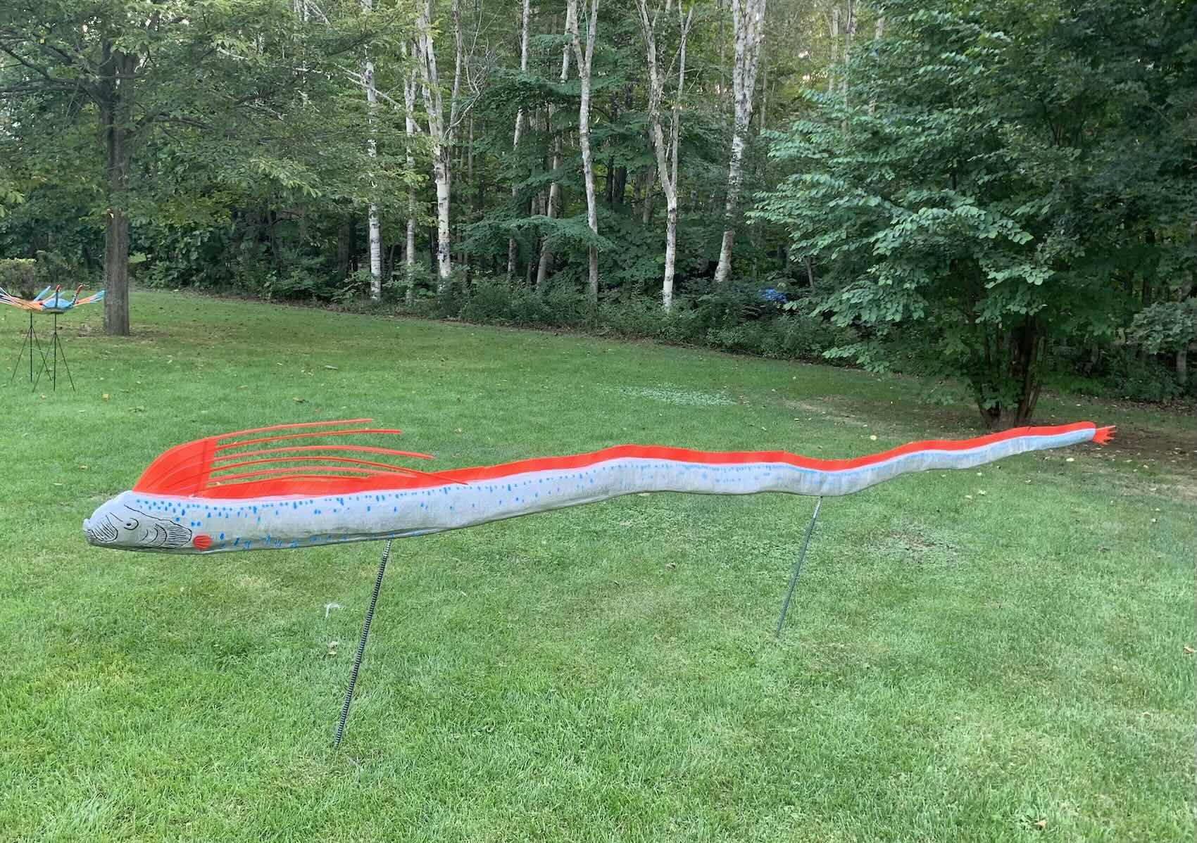 大型深海魚をモチーフにした3m近い大作。流れるような魚体、目の覚めるような真紅の背、立髪のようなひれ。