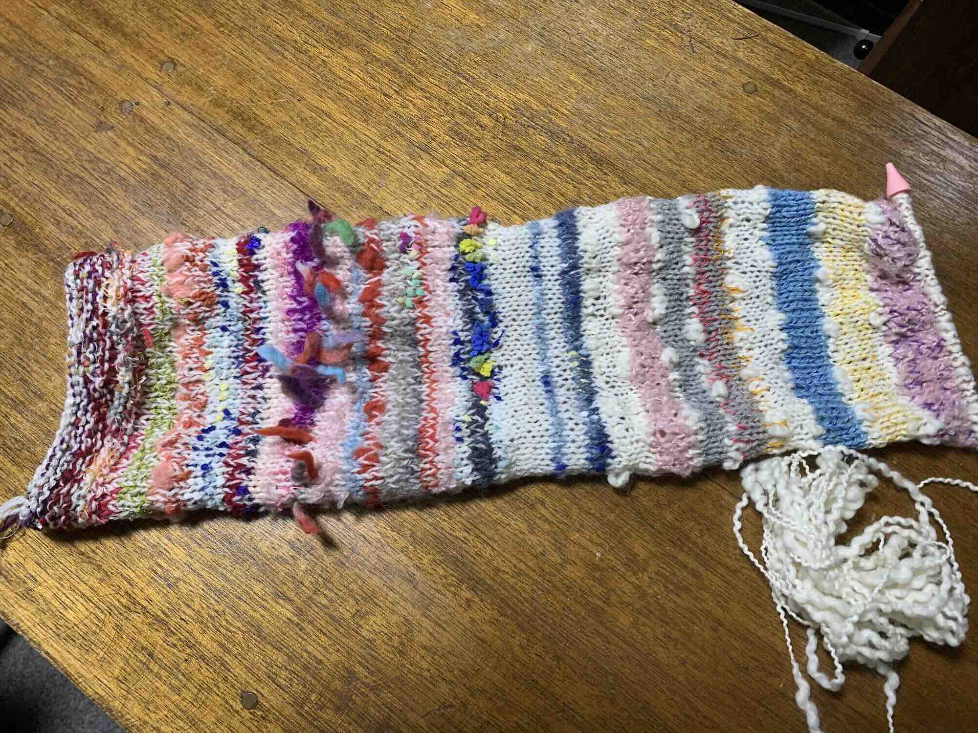 今日もかごのアイデアに煮詰まり、気分転換にマフラーを編みはじめました。手持ちの毛糸や絹糸や刺繍糸、そしてリボンや原毛まで使って気の向くままに針を進めていたら、楽しくて止まらなくなりました。